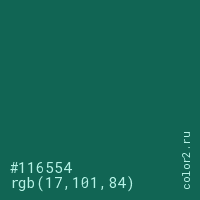 Цвет #116554 в цветовой модели RGB обозначается тремя октетами (17, 101, 84) в десятичном формате и #116554 в шестнадцатиричном (hex) формате, которые являются интенсивностью красного 17 (hex 11), интенсивность зелёного 101 (hex 65) и интенсивность синего 84 (hex 54).