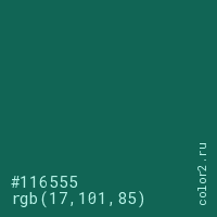 Цвет #116555 в цветовой модели RGB обозначается тремя октетами (17, 101, 85) в десятичном формате и #116555 в шестнадцатиричном (hex) формате, которые являются интенсивностью красного 17 (hex 11), интенсивность зелёного 101 (hex 65) и интенсивность синего 85 (hex 55).
