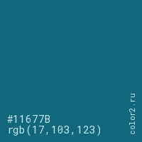 Цвет #11677B в цветовой модели RGB обозначается тремя октетами (17, 103, 123) в десятичном формате и #11677B в шестнадцатиричном (hex) формате, которые являются интенсивностью красного 17 (hex 11), интенсивность зелёного 103 (hex 67) и интенсивность синего 123 (hex 7B).
