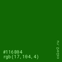Цвет #116804 в цветовой модели RGB обозначается тремя октетами (17, 104, 4) в десятичном формате и #116804 в шестнадцатиричном (hex) формате, которые являются интенсивностью красного 17 (hex 11), интенсивность зелёного 104 (hex 68) и интенсивность синего 4 (hex 04).