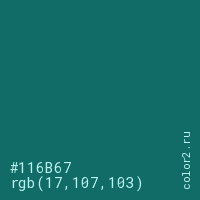 Цвет #116B67 в цветовой модели RGB обозначается тремя октетами (17, 107, 103) в десятичном формате и #116B67 в шестнадцатиричном (hex) формате, которые являются интенсивностью красного 17 (hex 11), интенсивность зелёного 107 (hex 6B) и интенсивность синего 103 (hex 67).
