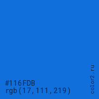 Цвет #116FDB в цветовой модели RGB обозначается тремя октетами (17, 111, 219) в десятичном формате и #116FDB в шестнадцатиричном (hex) формате, которые являются интенсивностью красного 17 (hex 11), интенсивность зелёного 111 (hex 6F) и интенсивность синего 219 (hex DB).