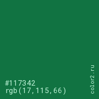 Цвет #117342 в цветовой модели RGB обозначается тремя октетами (17, 115, 66) в десятичном формате и #117342 в шестнадцатиричном (hex) формате, которые являются интенсивностью красного 17 (hex 11), интенсивность зелёного 115 (hex 73) и интенсивность синего 66 (hex 42).
