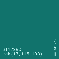 Цвет #11736C в цветовой модели RGB обозначается тремя октетами (17, 115, 108) в десятичном формате и #11736C в шестнадцатиричном (hex) формате, которые являются интенсивностью красного 17 (hex 11), интенсивность зелёного 115 (hex 73) и интенсивность синего 108 (hex 6C).