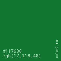 Цвет #117630 в цветовой модели RGB обозначается тремя октетами (17, 118, 48) в десятичном формате и #117630 в шестнадцатиричном (hex) формате, которые являются интенсивностью красного 17 (hex 11), интенсивность зелёного 118 (hex 76) и интенсивность синего 48 (hex 30).