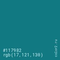 Цвет #117982 в цветовой модели RGB обозначается тремя октетами (17, 121, 130) в десятичном формате и #117982 в шестнадцатиричном (hex) формате, которые являются интенсивностью красного 17 (hex 11), интенсивность зелёного 121 (hex 79) и интенсивность синего 130 (hex 82).