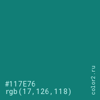 Цвет #117E76 в цветовой модели RGB обозначается тремя октетами (17, 126, 118) в десятичном формате и #117E76 в шестнадцатиричном (hex) формате, которые являются интенсивностью красного 17 (hex 11), интенсивность зелёного 126 (hex 7E) и интенсивность синего 118 (hex 76).