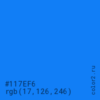 Цвет #117EF6 в цветовой модели RGB обозначается тремя октетами (17, 126, 246) в десятичном формате и #117EF6 в шестнадцатиричном (hex) формате, которые являются интенсивностью красного 17 (hex 11), интенсивность зелёного 126 (hex 7E) и интенсивность синего 246 (hex F6).