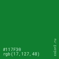 Цвет #117F30 в цветовой модели RGB обозначается тремя октетами (17, 127, 48) в десятичном формате и #117F30 в шестнадцатиричном (hex) формате, которые являются интенсивностью красного 17 (hex 11), интенсивность зелёного 127 (hex 7F) и интенсивность синего 48 (hex 30).
