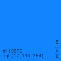 Цвет #1185FE в цветовой модели RGB обозначается тремя октетами (17, 133, 254) в десятичном формате и #1185FE в шестнадцатиричном (hex) формате, которые являются интенсивностью красного 17 (hex 11), интенсивность зелёного 133 (hex 85) и интенсивность синего 254 (hex FE).