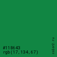 Цвет #118643 в цветовой модели RGB обозначается тремя октетами (17, 134, 67) в десятичном формате и #118643 в шестнадцатиричном (hex) формате, которые являются интенсивностью красного 17 (hex 11), интенсивность зелёного 134 (hex 86) и интенсивность синего 67 (hex 43).