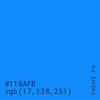 Цвет #118AFB в цветовой модели RGB обозначается тремя октетами (17, 138, 251) в десятичном формате и #118AFB в шестнадцатиричном (hex) формате, которые являются интенсивностью красного 17 (hex 11), интенсивность зелёного 138 (hex 8A) и интенсивность синего 251 (hex FB).