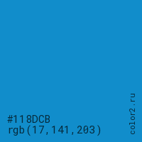 Цвет #118DCB в цветовой модели RGB обозначается тремя октетами (17, 141, 203) в десятичном формате и #118DCB в шестнадцатиричном (hex) формате, которые являются интенсивностью красного 17 (hex 11), интенсивность зелёного 141 (hex 8D) и интенсивность синего 203 (hex CB).