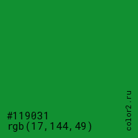 Цвет #119031 в цветовой модели RGB обозначается тремя октетами (17, 144, 49) в десятичном формате и #119031 в шестнадцатиричном (hex) формате, которые являются интенсивностью красного 17 (hex 11), интенсивность зелёного 144 (hex 90) и интенсивность синего 49 (hex 31).