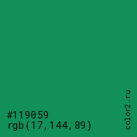 Цвет #119059 в цветовой модели RGB обозначается тремя октетами (17, 144, 89) в десятичном формате и #119059 в шестнадцатиричном (hex) формате, которые являются интенсивностью красного 17 (hex 11), интенсивность зелёного 144 (hex 90) и интенсивность синего 89 (hex 59).