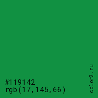Цвет #119142 в цветовой модели RGB обозначается тремя октетами (17, 145, 66) в десятичном формате и #119142 в шестнадцатиричном (hex) формате, которые являются интенсивностью красного 17 (hex 11), интенсивность зелёного 145 (hex 91) и интенсивность синего 66 (hex 42).