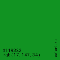Цвет #119322 в цветовой модели RGB обозначается тремя октетами (17, 147, 34) в десятичном формате и #119322 в шестнадцатиричном (hex) формате, которые являются интенсивностью красного 17 (hex 11), интенсивность зелёного 147 (hex 93) и интенсивность синего 34 (hex 22).