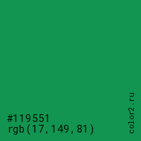 Цвет #119551 в цветовой модели RGB обозначается тремя октетами (17, 149, 81) в десятичном формате и #119551 в шестнадцатиричном (hex) формате, которые являются интенсивностью красного 17 (hex 11), интенсивность зелёного 149 (hex 95) и интенсивность синего 81 (hex 51).