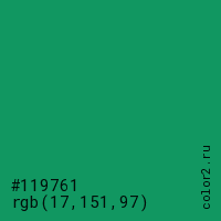 Цвет #119761 в цветовой модели RGB обозначается тремя октетами (17, 151, 97) в десятичном формате и #119761 в шестнадцатиричном (hex) формате, которые являются интенсивностью красного 17 (hex 11), интенсивность зелёного 151 (hex 97) и интенсивность синего 97 (hex 61).