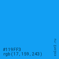Цвет #119FF3 в цветовой модели RGB обозначается тремя октетами (17, 159, 243) в десятичном формате и #119FF3 в шестнадцатиричном (hex) формате, которые являются интенсивностью красного 17 (hex 11), интенсивность зелёного 159 (hex 9F) и интенсивность синего 243 (hex F3).