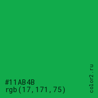 Цвет #11AB4B в цветовой модели RGB обозначается тремя октетами (17, 171, 75) в десятичном формате и #11AB4B в шестнадцатиричном (hex) формате, которые являются интенсивностью красного 17 (hex 11), интенсивность зелёного 171 (hex AB) и интенсивность синего 75 (hex 4B).