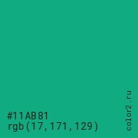 Цвет #11AB81 в цветовой модели RGB обозначается тремя октетами (17, 171, 129) в десятичном формате и #11AB81 в шестнадцатиричном (hex) формате, которые являются интенсивностью красного 17 (hex 11), интенсивность зелёного 171 (hex AB) и интенсивность синего 129 (hex 81).
