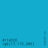 Цвет #11ACCE в цветовой модели RGB обозначается тремя октетами (17, 172, 206) в десятичном формате и #11ACCE в шестнадцатиричном (hex) формате, которые являются интенсивностью красного 17 (hex 11), интенсивность зелёного 172 (hex AC) и интенсивность синего 206 (hex CE).