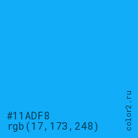Цвет #11ADF8 в цветовой модели RGB обозначается тремя октетами (17, 173, 248) в десятичном формате и #11ADF8 в шестнадцатиричном (hex) формате, которые являются интенсивностью красного 17 (hex 11), интенсивность зелёного 173 (hex AD) и интенсивность синего 248 (hex F8).
