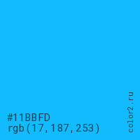 Цвет #11BBFD в цветовой модели RGB обозначается тремя октетами (17, 187, 253) в десятичном формате и #11BBFD в шестнадцатиричном (hex) формате, которые являются интенсивностью красного 17 (hex 11), интенсивность зелёного 187 (hex BB) и интенсивность синего 253 (hex FD).
