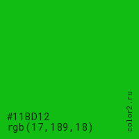 Цвет #11BD12 в цветовой модели RGB обозначается тремя октетами (17, 189, 18) в десятичном формате и #11BD12 в шестнадцатиричном (hex) формате, которые являются интенсивностью красного 17 (hex 11), интенсивность зелёного 189 (hex BD) и интенсивность синего 18 (hex 12).