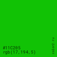Цвет #11C205 в цветовой модели RGB обозначается тремя октетами (17, 194, 5) в десятичном формате и #11C205 в шестнадцатиричном (hex) формате, которые являются интенсивностью красного 17 (hex 11), интенсивность зелёного 194 (hex C2) и интенсивность синего 5 (hex 05).