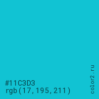 Цвет #11C3D3 в цветовой модели RGB обозначается тремя октетами (17, 195, 211) в десятичном формате и #11C3D3 в шестнадцатиричном (hex) формате, которые являются интенсивностью красного 17 (hex 11), интенсивность зелёного 195 (hex C3) и интенсивность синего 211 (hex D3).