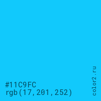Цвет #11C9FC в цветовой модели RGB обозначается тремя октетами (17, 201, 252) в десятичном формате и #11C9FC в шестнадцатиричном (hex) формате, которые являются интенсивностью красного 17 (hex 11), интенсивность зелёного 201 (hex C9) и интенсивность синего 252 (hex FC).