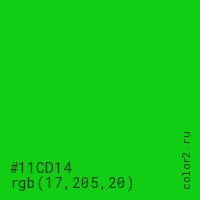 Цвет #11CD14 в цветовой модели RGB обозначается тремя октетами (17, 205, 20) в десятичном формате и #11CD14 в шестнадцатиричном (hex) формате, которые являются интенсивностью красного 17 (hex 11), интенсивность зелёного 205 (hex CD) и интенсивность синего 20 (hex 14).