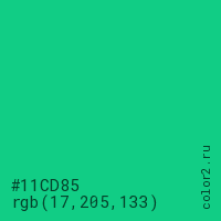 Цвет #11CD85 в цветовой модели RGB обозначается тремя октетами (17, 205, 133) в десятичном формате и #11CD85 в шестнадцатиричном (hex) формате, которые являются интенсивностью красного 17 (hex 11), интенсивность зелёного 205 (hex CD) и интенсивность синего 133 (hex 85).
