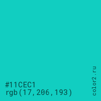 Цвет #11CEC1 в цветовой модели RGB обозначается тремя октетами (17, 206, 193) в десятичном формате и #11CEC1 в шестнадцатиричном (hex) формате, которые являются интенсивностью красного 17 (hex 11), интенсивность зелёного 206 (hex CE) и интенсивность синего 193 (hex C1).