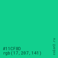 Цвет #11CF8D в цветовой модели RGB обозначается тремя октетами (17, 207, 141) в десятичном формате и #11CF8D в шестнадцатиричном (hex) формате, которые являются интенсивностью красного 17 (hex 11), интенсивность зелёного 207 (hex CF) и интенсивность синего 141 (hex 8D).