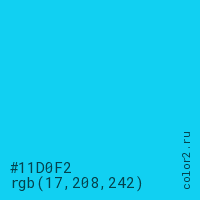 Цвет #11D0F2 в цветовой модели RGB обозначается тремя октетами (17, 208, 242) в десятичном формате и #11D0F2 в шестнадцатиричном (hex) формате, которые являются интенсивностью красного 17 (hex 11), интенсивность зелёного 208 (hex D0) и интенсивность синего 242 (hex F2).