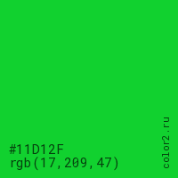 Цвет #11D12F в цветовой модели RGB обозначается тремя октетами (17, 209, 47) в десятичном формате и #11D12F в шестнадцатиричном (hex) формате, которые являются интенсивностью красного 17 (hex 11), интенсивность зелёного 209 (hex D1) и интенсивность синего 47 (hex 2F).