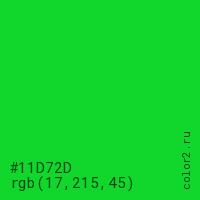 Цвет #11D72D в цветовой модели RGB обозначается тремя октетами (17, 215, 45) в десятичном формате и #11D72D в шестнадцатиричном (hex) формате, которые являются интенсивностью красного 17 (hex 11), интенсивность зелёного 215 (hex D7) и интенсивность синего 45 (hex 2D).