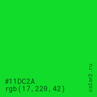 Цвет #11DC2A в цветовой модели RGB обозначается тремя октетами (17, 220, 42) в десятичном формате и #11DC2A в шестнадцатиричном (hex) формате, которые являются интенсивностью красного 17 (hex 11), интенсивность зелёного 220 (hex DC) и интенсивность синего 42 (hex 2A).