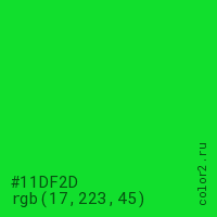 Цвет #11DF2D в цветовой модели RGB обозначается тремя октетами (17, 223, 45) в десятичном формате и #11DF2D в шестнадцатиричном (hex) формате, которые являются интенсивностью красного 17 (hex 11), интенсивность зелёного 223 (hex DF) и интенсивность синего 45 (hex 2D).