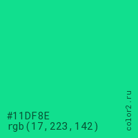 Цвет #11DF8E в цветовой модели RGB обозначается тремя октетами (17, 223, 142) в десятичном формате и #11DF8E в шестнадцатиричном (hex) формате, которые являются интенсивностью красного 17 (hex 11), интенсивность зелёного 223 (hex DF) и интенсивность синего 142 (hex 8E).
