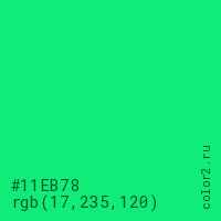 Цвет #11EB78 в цветовой модели RGB обозначается тремя октетами (17, 235, 120) в десятичном формате и #11EB78 в шестнадцатиричном (hex) формате, которые являются интенсивностью красного 17 (hex 11), интенсивность зелёного 235 (hex EB) и интенсивность синего 120 (hex 78).