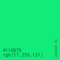 Цвет #11EB79 в цветовой модели RGB обозначается тремя октетами (17, 235, 121) в десятичном формате и #11EB79 в шестнадцатиричном (hex) формате, которые являются интенсивностью красного 17 (hex 11), интенсивность зелёного 235 (hex EB) и интенсивность синего 121 (hex 79).