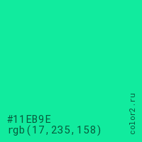 Цвет #11EB9E в цветовой модели RGB обозначается тремя октетами (17, 235, 158) в десятичном формате и #11EB9E в шестнадцатиричном (hex) формате, которые являются интенсивностью красного 17 (hex 11), интенсивность зелёного 235 (hex EB) и интенсивность синего 158 (hex 9E).