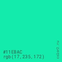 Цвет #11EBAC в цветовой модели RGB обозначается тремя октетами (17, 235, 172) в десятичном формате и #11EBAC в шестнадцатиричном (hex) формате, которые являются интенсивностью красного 17 (hex 11), интенсивность зелёного 235 (hex EB) и интенсивность синего 172 (hex AC).