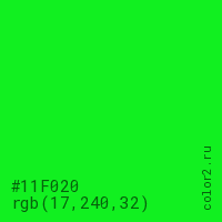 Цвет #11F020 в цветовой модели RGB обозначается тремя октетами (17, 240, 32) в десятичном формате и #11F020 в шестнадцатиричном (hex) формате, которые являются интенсивностью красного 17 (hex 11), интенсивность зелёного 240 (hex F0) и интенсивность синего 32 (hex 20).