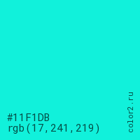 Цвет #11F1DB в цветовой модели RGB обозначается тремя октетами (17, 241, 219) в десятичном формате и #11F1DB в шестнадцатиричном (hex) формате, которые являются интенсивностью красного 17 (hex 11), интенсивность зелёного 241 (hex F1) и интенсивность синего 219 (hex DB).