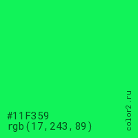 Цвет #11F359 в цветовой модели RGB обозначается тремя октетами (17, 243, 89) в десятичном формате и #11F359 в шестнадцатиричном (hex) формате, которые являются интенсивностью красного 17 (hex 11), интенсивность зелёного 243 (hex F3) и интенсивность синего 89 (hex 59).